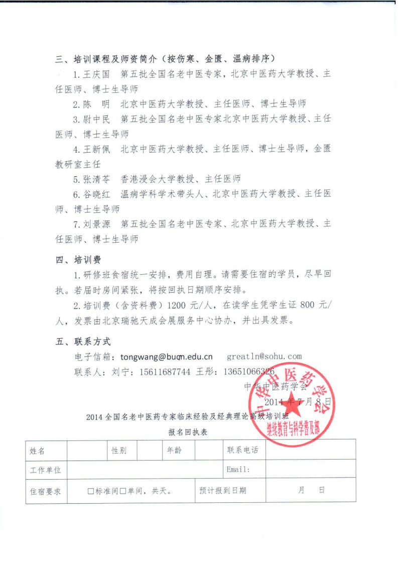 关于举办2014全国名老中医药专家临床经验及经典理论高级培训班的通知