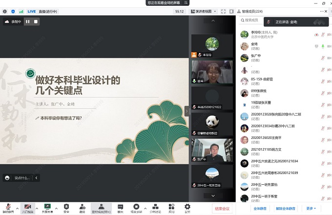 讲座伊始,张广中教授关于毕业论文的撰写提出三点总论:“兴趣是最好的老师”作者本身要选择自己有兴趣的课题;充实自身课题的意义性;把握大量且多领域的文献。为使同学切实完善毕业论文的设计思维,金琦同学详细讲述了其论文写作的经验,金琦同学根据首先以“如何选题”切入主旨并建议同学们可以从临床出发进行深入挖掘,随后分析本学年优秀毕业论文的思维特征及优势,为同学们开阔设计思维并指引方向,并强调在选题前要确认“资料、自己、导师”三个要素。其后向同学们讲述论文设计一般流程,以五类文章为例为大家构建论文写作思路。讲座后期,金琦同学向大家总结毕业论文初稿写作的基本框架,同时建议大家在初稿完成后审阅自身是否逻辑自洽、论述完整、理论普适,强调论文修订的必要性。最后向大家交流论文设计过程中可能出现的困难,给予同学们一定的鼓励与解决方案。本次讲座以经验介绍的形式,从金琦同学自身写论文的历程与感触出发,向大家系统讲述设计思路并分析一篇优秀论文的所需要点。张广中教授作为金琦同学本科毕业论文指导老师和研究生导师,师生强强联合为同学们带来的讲解受到大家欢迎,365英国上市集团及各附属医院员工逾六百人通过腾讯会议与北中医微课堂直播参与此次讲座。