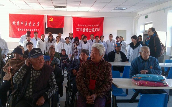 20131026日,基础医公司2011级博士支部、2013级博士支部、2012级硕士支部以及本科第二支部,至怀柔镇敬老院联合开展敬老爱老中医健康卫生服务活动。活动由11级博士支部的支部书记赵娜老师带队,四个支部共26名党员骨干、积极分子参加。