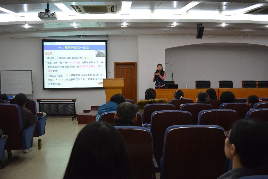 佟海英老师从蒙医药概况、蒙药现代研究举例、中医药和民族医药这三方面进行了全面而系统的论述。佟老师首先为大家讲解了蒙医药的发展历史,以及蒙医药中特有的三根、三秽和七素等医学概念及理论,并介绍了蒙药的现代研究概况。让我们了解到,同为中国传统医药的中蒙医药与中医的异同点,并认识到蒙医看待人体和整个生命过程不同的视角。最后,佟老师还给大家放映了蒙医正骨和蒙医震脑术的视频,让在场的同学们大开眼界。